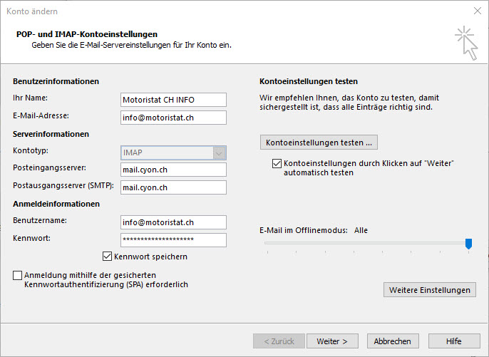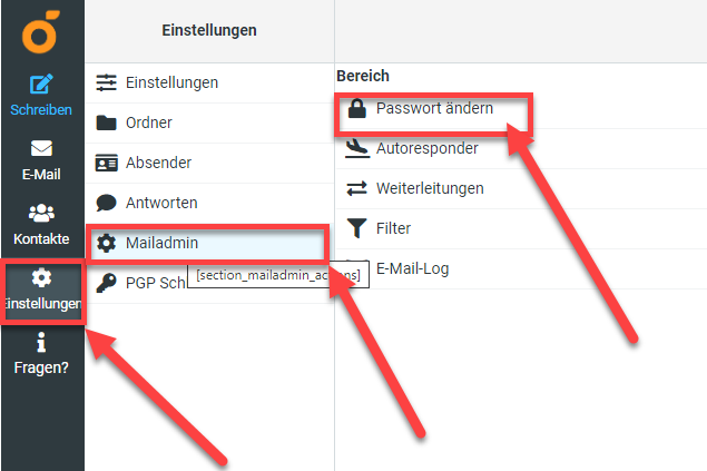 Klikoni tek Einstellungen, pastaj Mailadmin, pasta, nese doni te nderroni passwordin, klikoni Password ändern. Passwortin e krijur, ju lutem shenojni ne Notiz apo dikund tjeter.